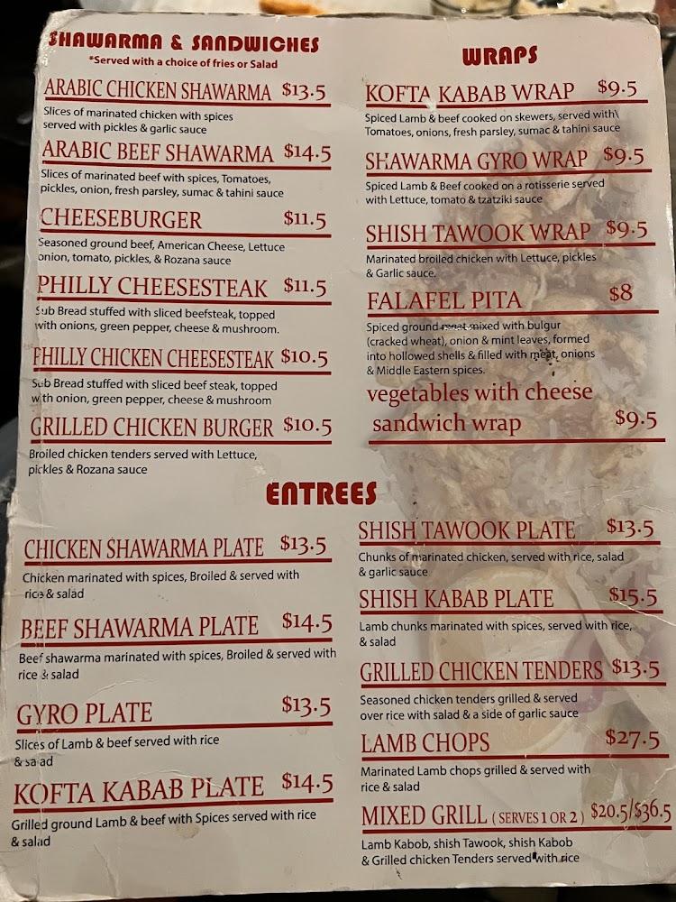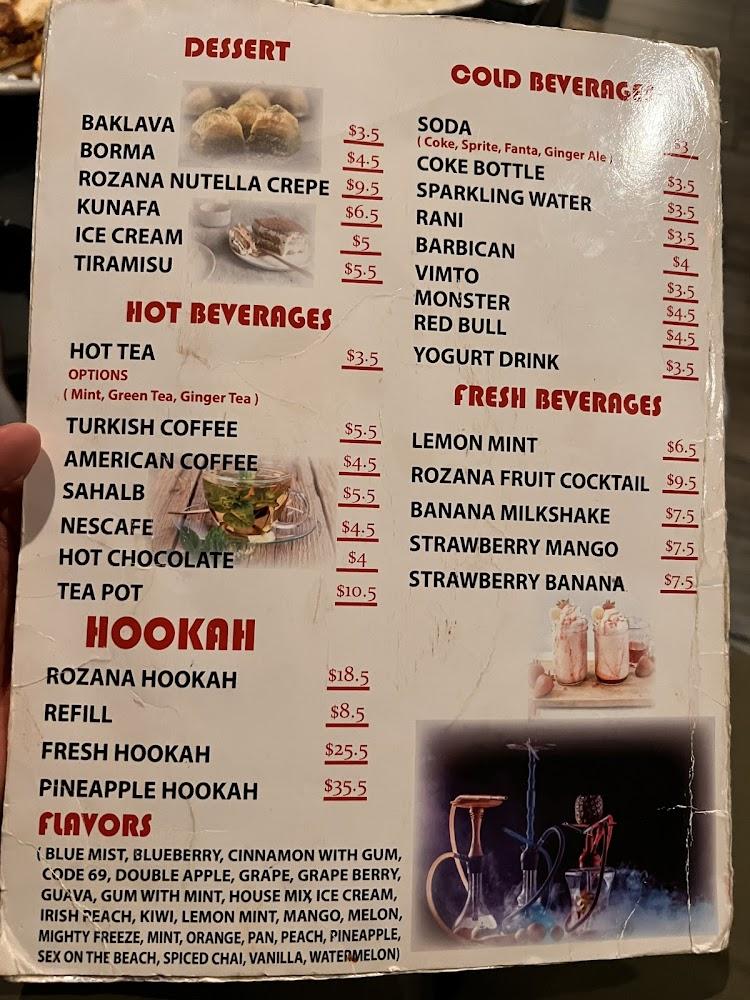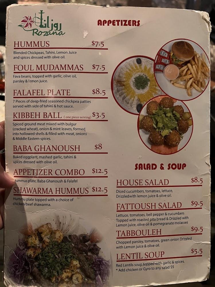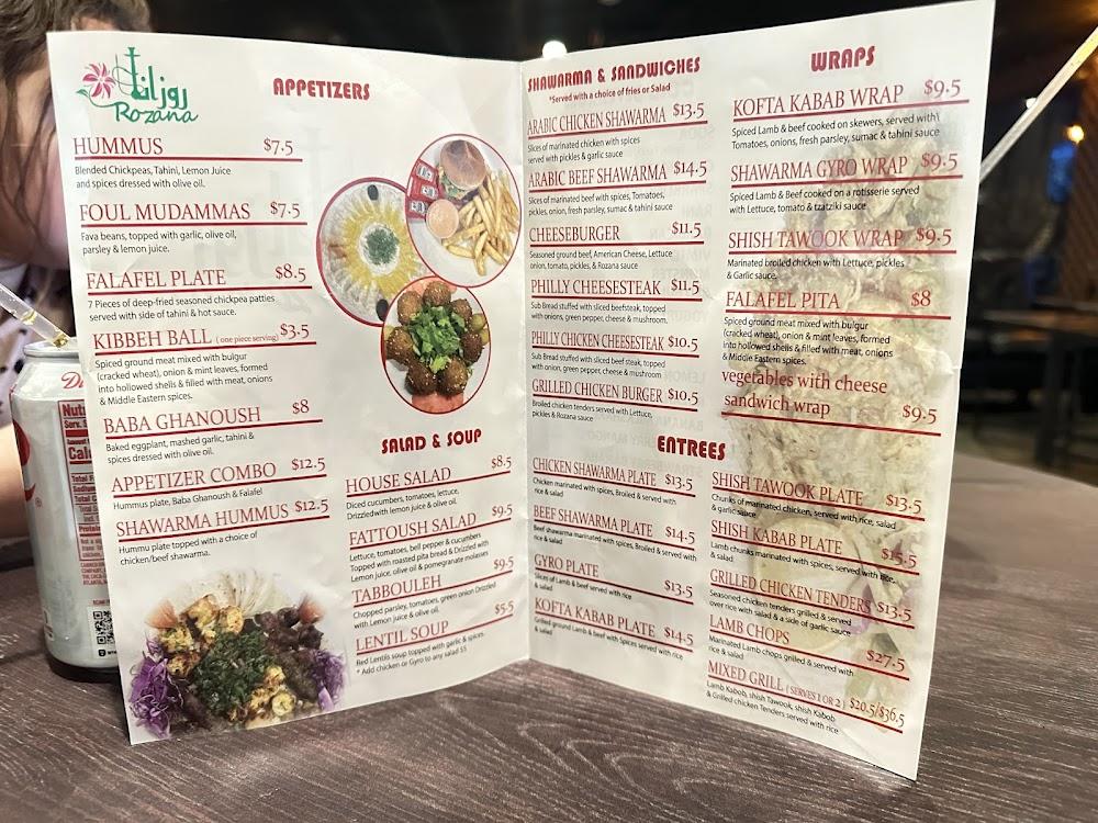 Rozana's menu is a celebration of Middle Eastern cuisine. Diners can indulge in appetizers like hummus and baba ganoush or delight in main courses such as shish kabab and chicken rice specials. The variety caters to all tastes and dietary needs, including halal and vegetarian options.
